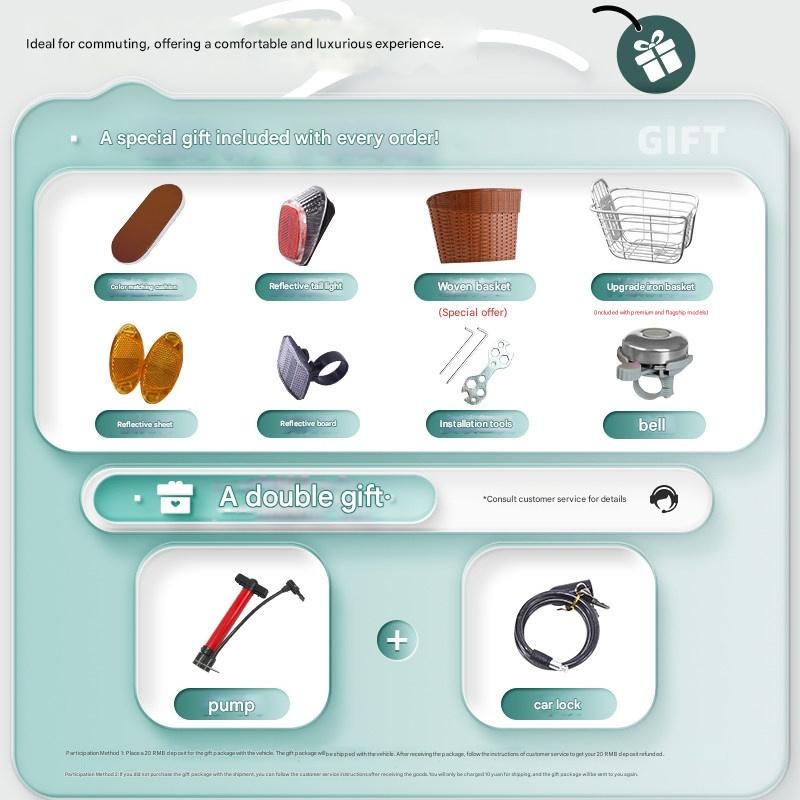 | Color | Inflatable Tire Girl Cream Tire, Metal Basket & Cloud Seat Mint Green, Inflatable Tire Girl Cream Tire, Metal Basket & Cloud Seat Purple Yam, Inflatable Tire Girl Cream Tire, Metal Basket & Cloud Seat White, Inflatable Tire Girl Cream Tire, Metal Basket & Cloud Seat Yellow, Inflatable Tire Metal Basket & Cloud Seat Mint Green, Inflatable Tire Metal Basket & Cloud Seat Purple Yam, Inflatable Tire Metal Basket & Cloud Seat White, Inflatable Tire Metal Basket & Cloud Seat Yellow, Inflatable Tire Wicker Basket Mint Green, Inflatable Tire Wicker Basket Purple Yam, Inflatable Tire Wicker Basket White, Inflatable Tire Wicker Basket Yellow, Solid Tire Girl Cream Tire, Metal Basket & Cloud Seat Mint Green, Solid Tire Girl Cream Tire, Metal Basket & Cloud Seat Purple Yam, Solid Tire Girl Cream Tire, Metal Basket & Cloud Seat White, Solid Tire Girl Cream Tire, Metal Basket & Cloud Seat Yellow, Solid Tire Metal Basket & Cloud Seat Mint Green, Solid Tire Metal Basket & Cloud Seat Purple Yam, Solid Tire Metal Basket & Cloud Seat White, Solid Tire Metal Basket & Cloud Seat Yellow |