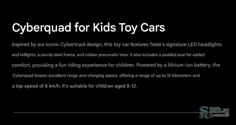 Experience the thrill of the Tesla Cyberquad for Kids, an all-electric ride-on toy built for adventure. Its air-cooled motor powers exciting off-road fun, perfect for young explorers seeking backyard or beachside excitement. Give the gift of innovative play that sparks imagination and outdoor joy.