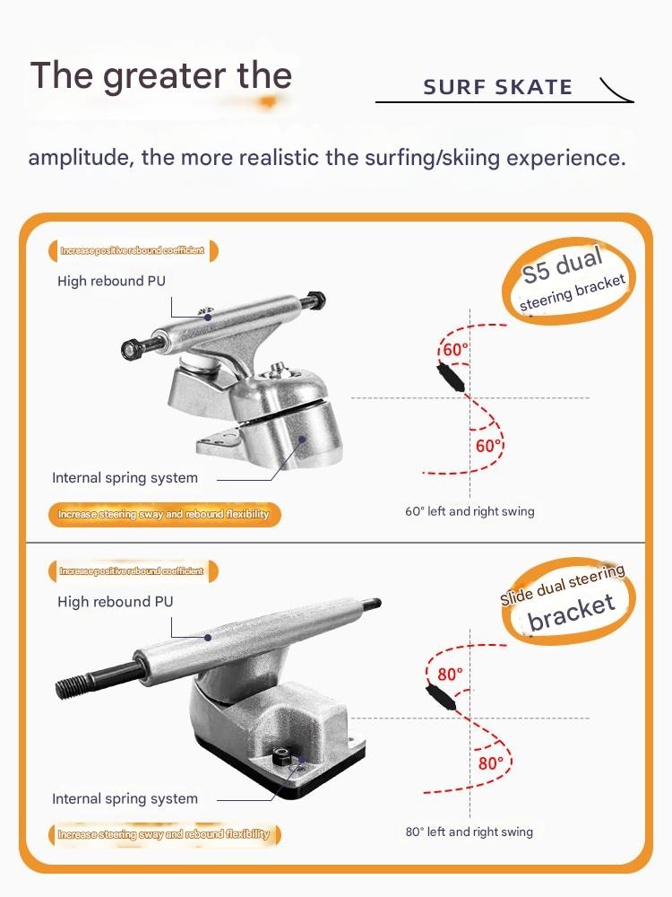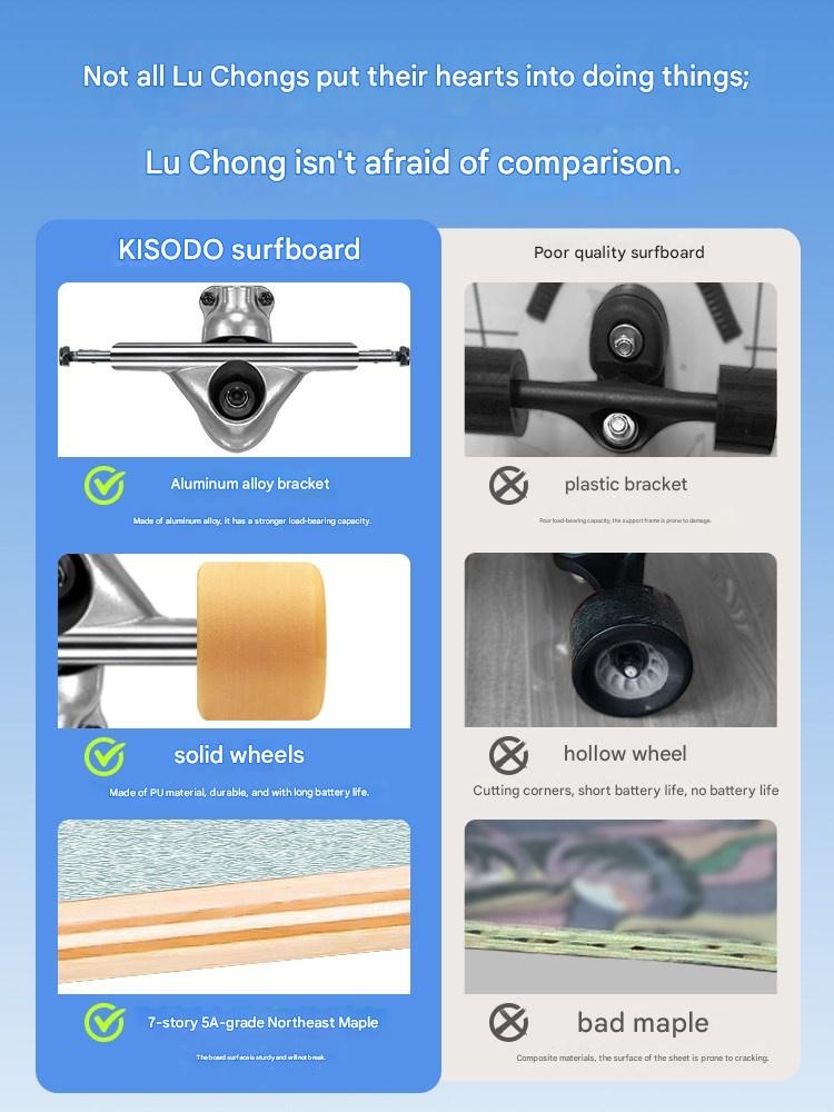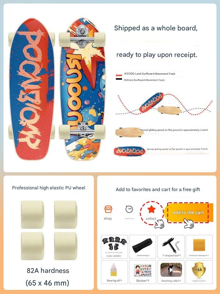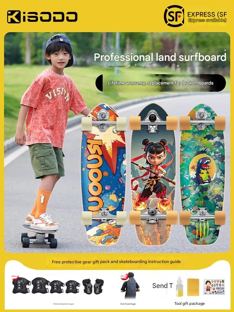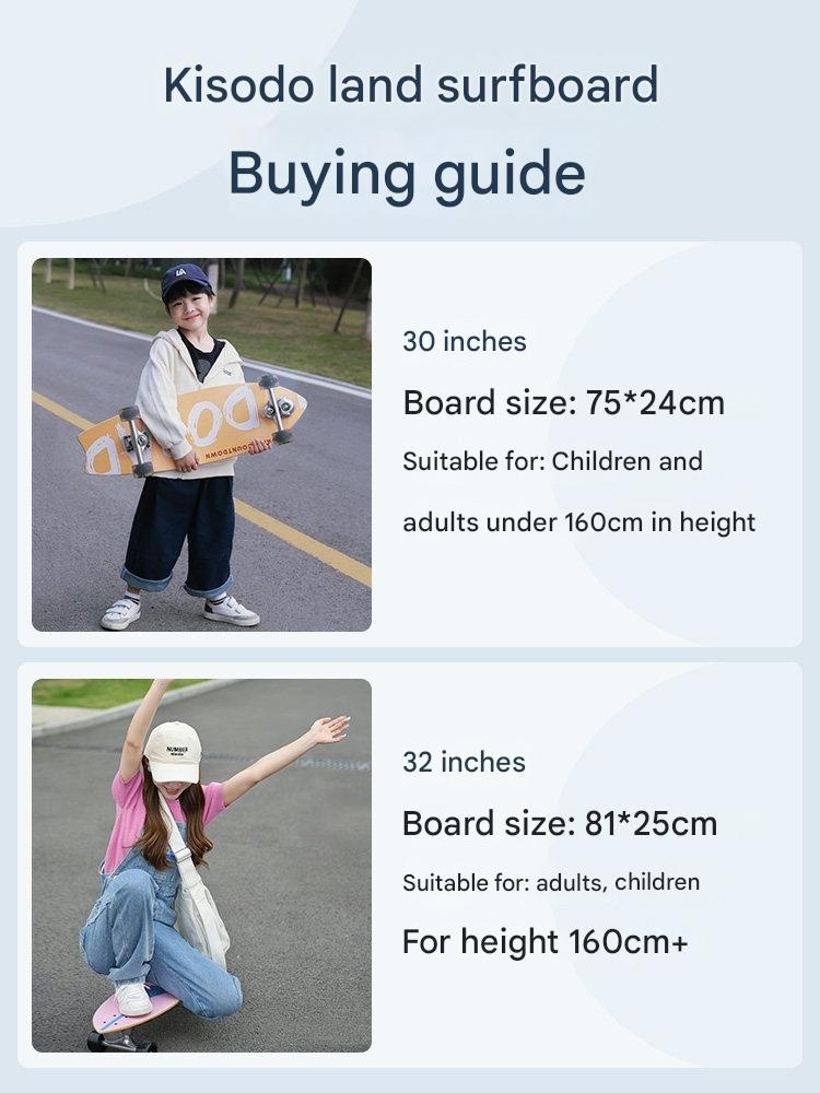 Master the streets with our versatile land surfboard, featuring dual steering for easy learning and smooth carving. Perfect for kids and adults starting their road surfing journey, it grows with your skills. Feel the freedom of a unique ride designed for lasting fun and adventure.