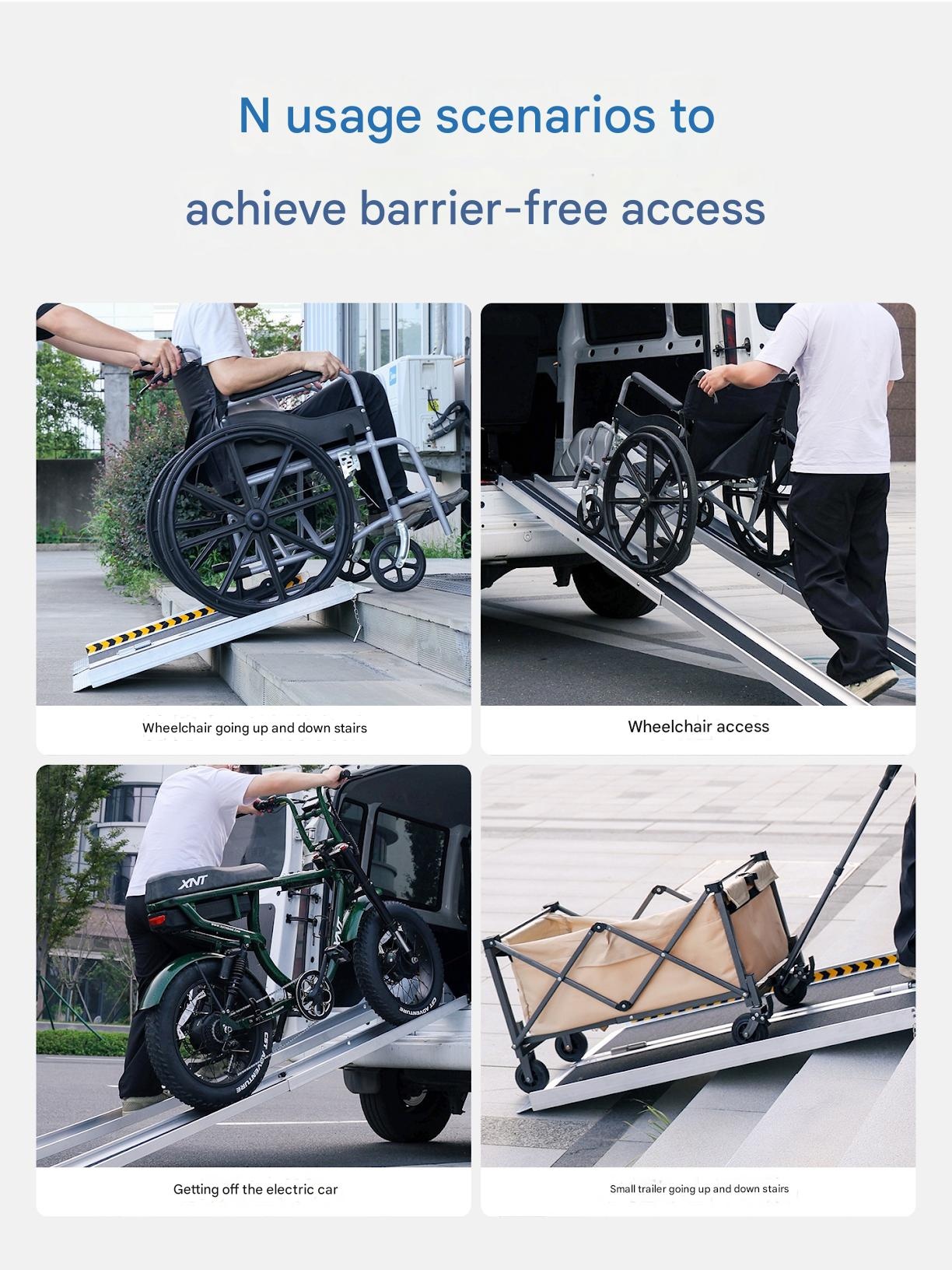 This portable aluminum wheelchair ramp provides safe, anti-slip access over steps and curbs. Its lightweight yet durable design supports heavy loads, making it perfect for enhancing home or vehicle accessibility. Experience greater independence and peace of mind with this essential mobility aid.