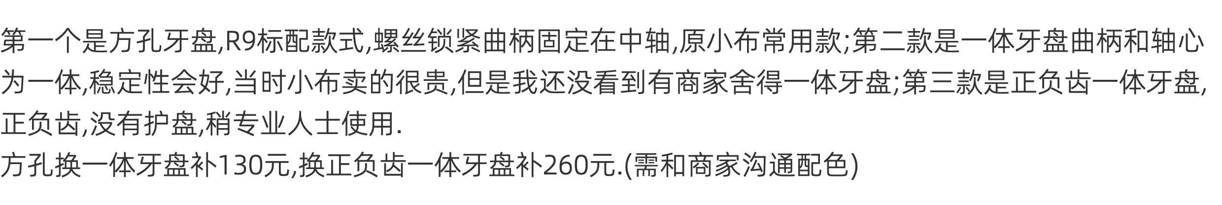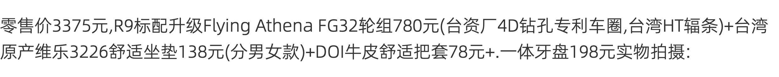 | Option | 2780 yuan R9 Black Red M-bar ≈12kg, 2780 yuan R9 Black Red straight bar ≈12kg, 2780 yuan R9 Electric Blue M-bar ≈12kg, 2780 yuan R9 Joyful Yellow M-bar ≈12kg, 2780 yuan R9 Phantom Purple M-bar ≈12kg, 2780 yuan R9 Titanium color M-bar ≈12kg, 2780 yuan R9 Vibrant Orange M-bar ≈12kg, 2780 yuan Silver with Black 9-speed complete bike M-bar ≈12kg, 2830 yuan R9 Arctic Blue M-bar ≈12kg, 2830 yuan R9 Matcha Green M-bar ≈12kg, 2830 yuan R9 Postal Green M-bar ≈12kg, 2830 yuan R9 Sea Breeze Blue M-bar ≈12kg, 2830 yuan R9 Silver Wing M-bar ≈12kg, 3030 yuan Postal Green 9-speed complete bike (change leather seat grips), 3180 yuan R9 Brushed Silver (Gun Gray) M-bar ≈12kg, 3180 yuan R9 Iridescent Chrome M-bar ≈12kg, 3255 yuan R9 modified FG wheelset, 3375 yuan R9 modified FG wheelset + Velo comfort saddle, 3885 yuan Electric Blue M-bar upgraded FG32 wheelset + Continental tires + LP pig nose + integrated crankset, 3885 yuan Modified A Electric Blue M-bar ≈11.5kg, 3885 yuan Modified A Modified high-speed version: Cloud Blue M-bar, 3885 yuan Modified A Modified high-speed version: Cloud Blue M-bar rider custom actual photo, 3885 yuan Modified A Modified high-speed version: Lemon Yellow M-bar actual photo page has configuration, 3885 yuan Modified A Pink M-bar rider custom actual photo, 3885 yuan Modified A Silver M-bar ≈11.5kg, 3930 yuan upgraded FG32 wheelset + integrated crankset + Continental tires + Velo saddle + colored easy wheels/cable housing, 4165 yuan R9 modified version, 4285 yuan Brushed Silver M-bar upgraded Continental brown tires + FG wheelset + LP aluminum pig nose + LP aluminum folding pedals, 4585 yuan Hong Kong rider custom, Brushed Silver + FG wheelset + Continental tires + Velo saddle + ODI ergonomic grips + telescopic rod, Brushed Silver M-bar upgraded aluminum pig nose change brown saddle grips, Brushed Silver straight bar + Continental reflective tires black match, Matcha Green straight bar Configuration A + toseek carbon saddle + LP quick-release pedals, Matcha Green upgraded FG32 wheelset add 375 yuan + integrated crankset 130 + Continental 260 + aluminum pig nose + LP aluminum folding pedals 70, Matcha Green upgraded FG32 wheelset add 375 yuan + integrated crankset 130 + Continental 260 + aluminum pig nose 40 + LP aluminum folding pedals 70 + Velo saddle 80, Milk Tea color M-bar VELO pink saddle + ODI pink grips, Mocha color M-bar Taiwan rider custom, New Product D9 disc brake Charcoal Gray 9-speed Japanese Shimano imported transmission, New Product D9 disc brake Morandi Gray 9-speed Japanese Shimano imported transmission, New Product D9 disc brake Peacock Green 9-speed Japanese Shimano imported transmission, New Product D9 disc brake Postal Green 9-speed Japanese Shimano imported transmission, Postal Green standard upgraded: F36 low-resistance wheelset + integrated crankset + Continental cream tires + Velo saddle + aluminum pig nose, R9 Dream Purple modified FG wheelset + Velo saddle + integrated crankset + LP pig nose pedals, R9 Fluorescent Green M-bar ≈12kg, R9 Mocha color M-bar ≈12kg, R9 Phantom Black M-bar ≈12kg, R9 Sakura Pink M-bar ≈12kg, R9 Violet M-bar 12kg, R9 modified FG wheelset + integrated crankset + LP aluminum pig nose pedals + integrated crankset + SR saddle + Kojak slick tires, R9 modified Velo saddle + Inova pink tires + LP aluminum pig nose pedals + pink cable housing grips, Silver M-bar VELO pink saddle + ODI pink grips, Silver with Black 9-speed M-bar upgraded LP pig nose black match 11.5kg, Value Configuration B modified upgrade color matching contact, Value Configuration D modified high-speed + low-resistance version: modified upgrade color matching contact, Value Pick Special: 3885 yuan Modified A Titanium color M-bar ≈11.5kg, Value Pick Special: 4015 yuan Brushed Silver upgraded FG32 wheelset + Continental tires + LP folding pedals + integrated crankset + LP aluminum pig nose + Velo saddle |