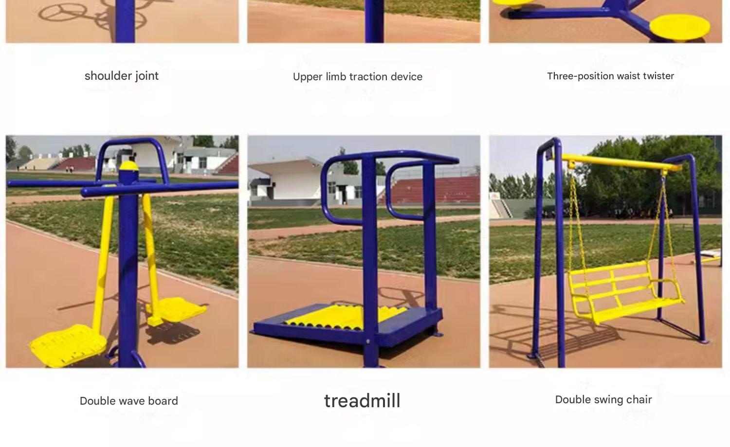| Set | Apricot Shoulder Joint, Army Green Leg Massager, Beige 3-Piece Set, Black 4-Piece Set, Blue Signboard, Bright Yellow Seesaw, Brown 13-Piece Set, Burgundy 5-Piece Set, Camel 14-Piece Set, Champagne 20-Piece Set, Champagne Gold Double Wheel, Chestnut Brown 9-Piece Set, Chocolate Brown 9-Piece Set, Coffee Brown 8-Piece Set, Cream White 3-Piece Set, Cyan 19-Piece Set, Dark Blue 4-Position Leg Press, Dark Brown 12-Piece Set, Dark Green Triple Waist Twister, Dark Khaki 11-Piece Set, Emerald Green Single Walker, Fluorescent Green Single Rider, Fluorescent Yellow Back Massager, Ginger Yellow Double Swing Chair, Gold 8-Piece Set, Green Single Stepper, Khaki Double Push-Pull, Lake Blue 17-Piece Set, Large White Single Walker, Lemon Yellow Upper Body Puller, Light Beige Double Walker, Light Blue Game Table, Light Brown 10-Piece Set, Light Green Rower, Light Purple Basketball Hoop, Light Yellow 18-Piece Set, Lotus Root 4-Piece Set, Navy Blue Treadmill, Orange Double Seated Leg Press, Orange Red 7-Piece Set, Patterned 15-Piece Set, Pink 6-Piece Set, Porcelain Blue Single Ab Board, Red 5-Piece Set, Rose Red 6-Piece Set, Sky Blue Parallel Bars, Transparent 16-Piece Set, Transparent White Basketball Hoop, White 3-Piece Set, Yellow Double Walker |
