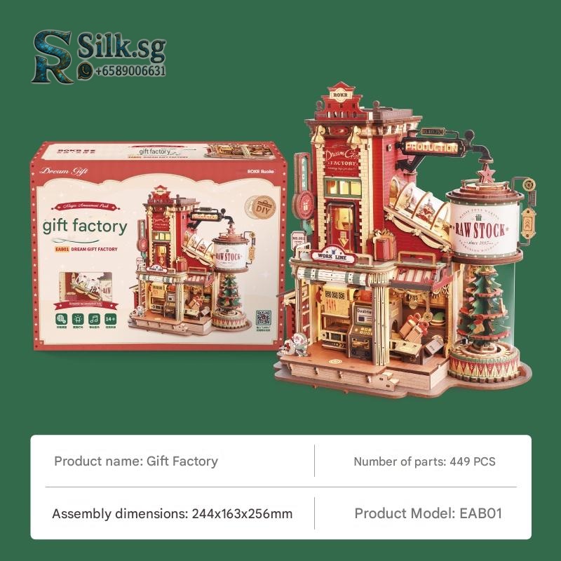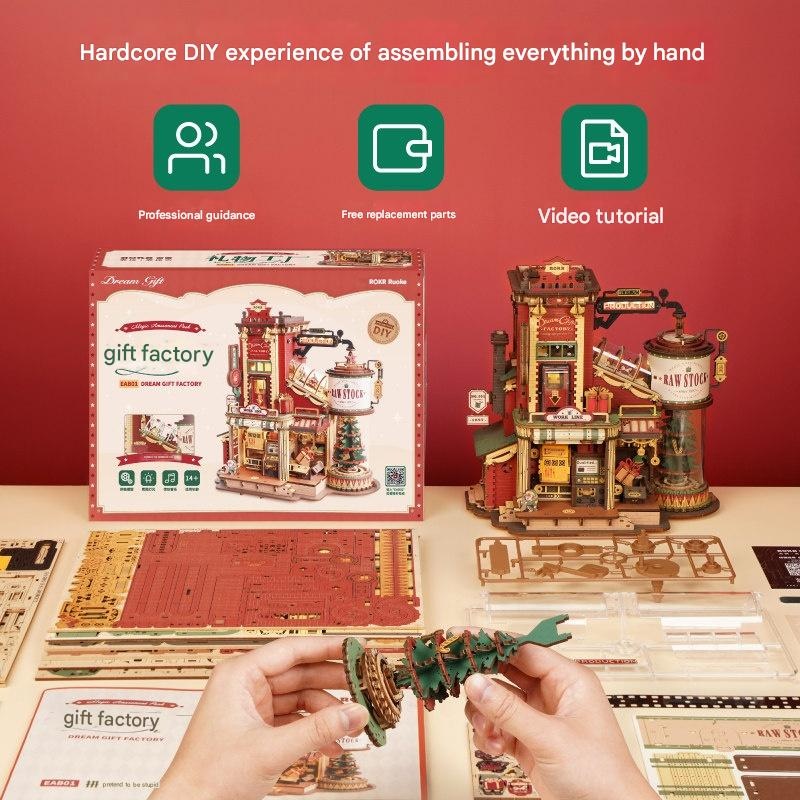 This creative wooden building block set brings a charming gift factory to life with music, lights, and moving parts. Perfect for a heartfelt DIY project, it offers a rewarding and memorable crafting experience. Discover the joy of building a unique keepsake for someone special.
