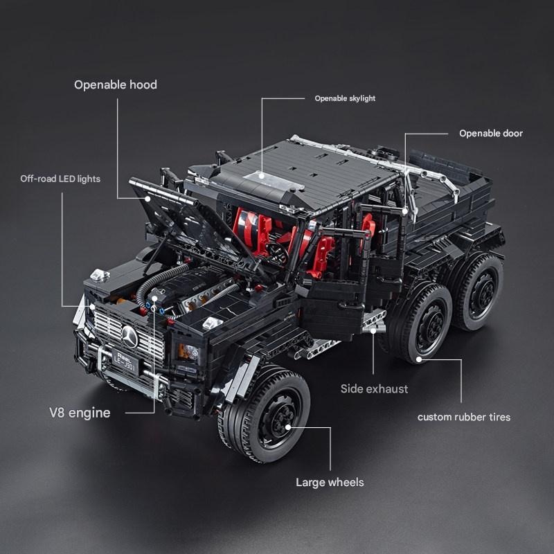 | Model | 4WD High-Speed Tank Turn Jeep Wrangler: 2545 pieces, Classic Land Rover Defender: 2575 pieces, Dynamic Lamborghini Urus with app remote, Motorized Black Warrior Jeep Wrangler with lights & app remote, Motorized Green Jeep Wrangler with lights & app remote, Motorized Mercedes Black Warrior with lights & app remote, Motorized Mercedes G-Class with lights & app remote: 6×6 cm, 6 g, Motorized Mercedes Pink G-Class with lights & app remote, Pull-Back Mercedes: 856 pieces, 6×6 cm, Static Black Warrior Jeep Wrangler: 2272 pieces, Static Green Jeep Wrangler: 2343 pieces, Static Lamborghini Urus: 3368 pieces, Static Mercedes Black Warrior: 2687 pieces, Static Mercedes G-Class: 3300+ pieces, 6×6 cm, 6 g, Static Mercedes Pink G-Class: 2687 pieces |