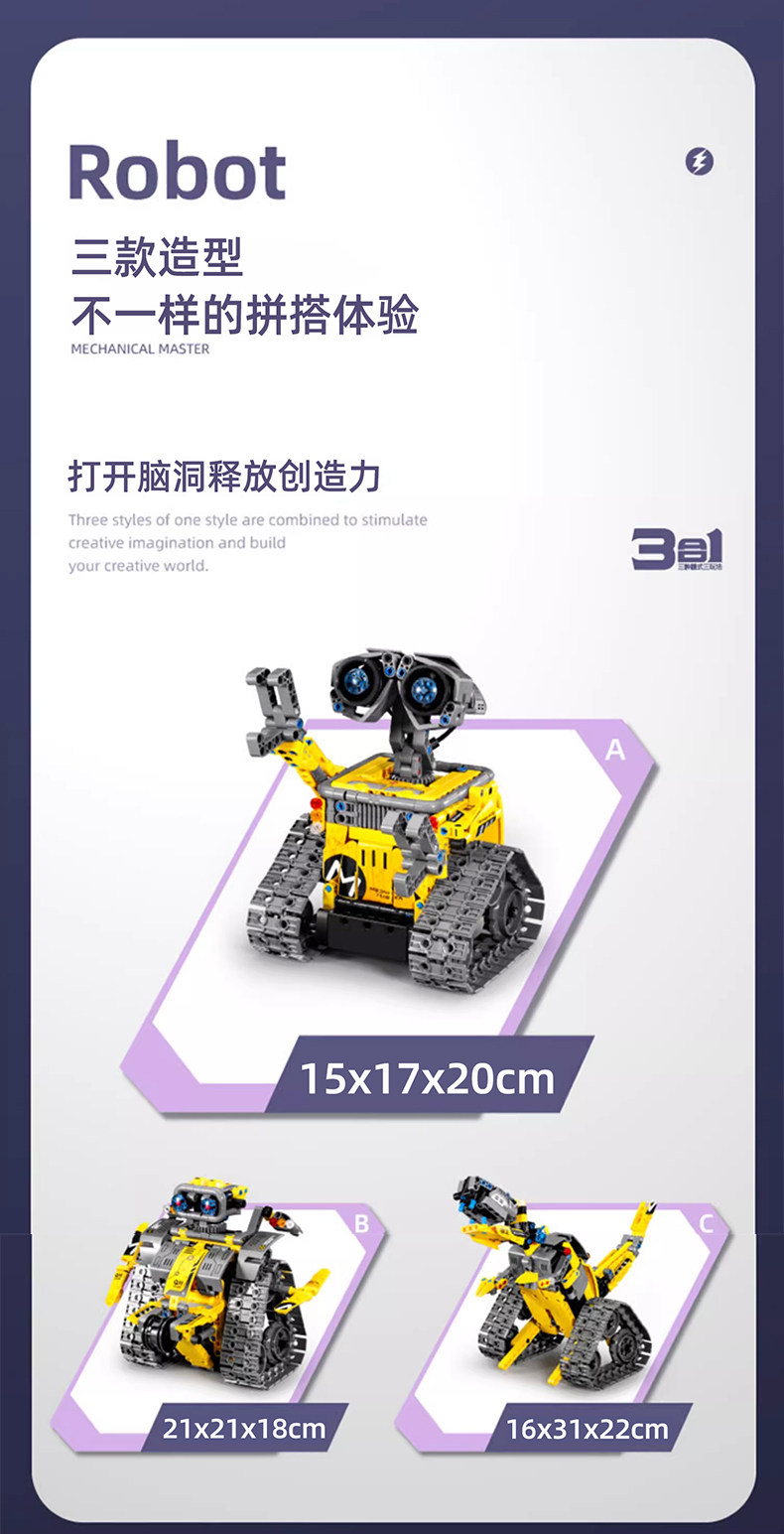 | Model | Classic 3-in-1: Bulldozer, Dump Truck & Command Vehicle (Remote & App), Classic 3-in-1: Robot, Motorcycle & Tank (Remote & App), Classic 3-in-1: Robot, Recon Tank & Laser Tank (Remote & App), Classic 3-in-1: WALL-E, Dinosaur & Chubby (Remote & App), Digital 3-in-1: Charizard with Remote Spray (Remote & App), Digital 3-in-1: Chinese Alligator with Remote Spray (Remote & App), Digital 3-in-1: Gaming Girl (Remote & App), Digital 3-in-1: Kaito Kid (Remote & App), Digital 3-in-1: Lunar Pioneer (Remote & App), Digital 3-in-1: Mechanical Snail (Remote & App), Digital 3-in-1: Trendy Guitarist (Remote & App), Digital 3-in-1: WALL-E Robot (Remote & App), Stunt 4-in-1: WALL-E, Chubby, Tank & Combat Vehicle (Remote & App), Stunt 5-in-1: Rescue Robot (Remote & App), Stunt 5-in-1: Star-Chasing Robot (Remote & App), Stunt 5-in-1: Stunt Car Robot (Remote & App) |