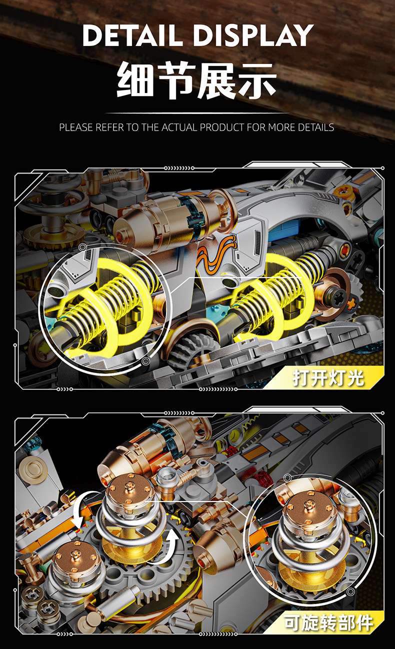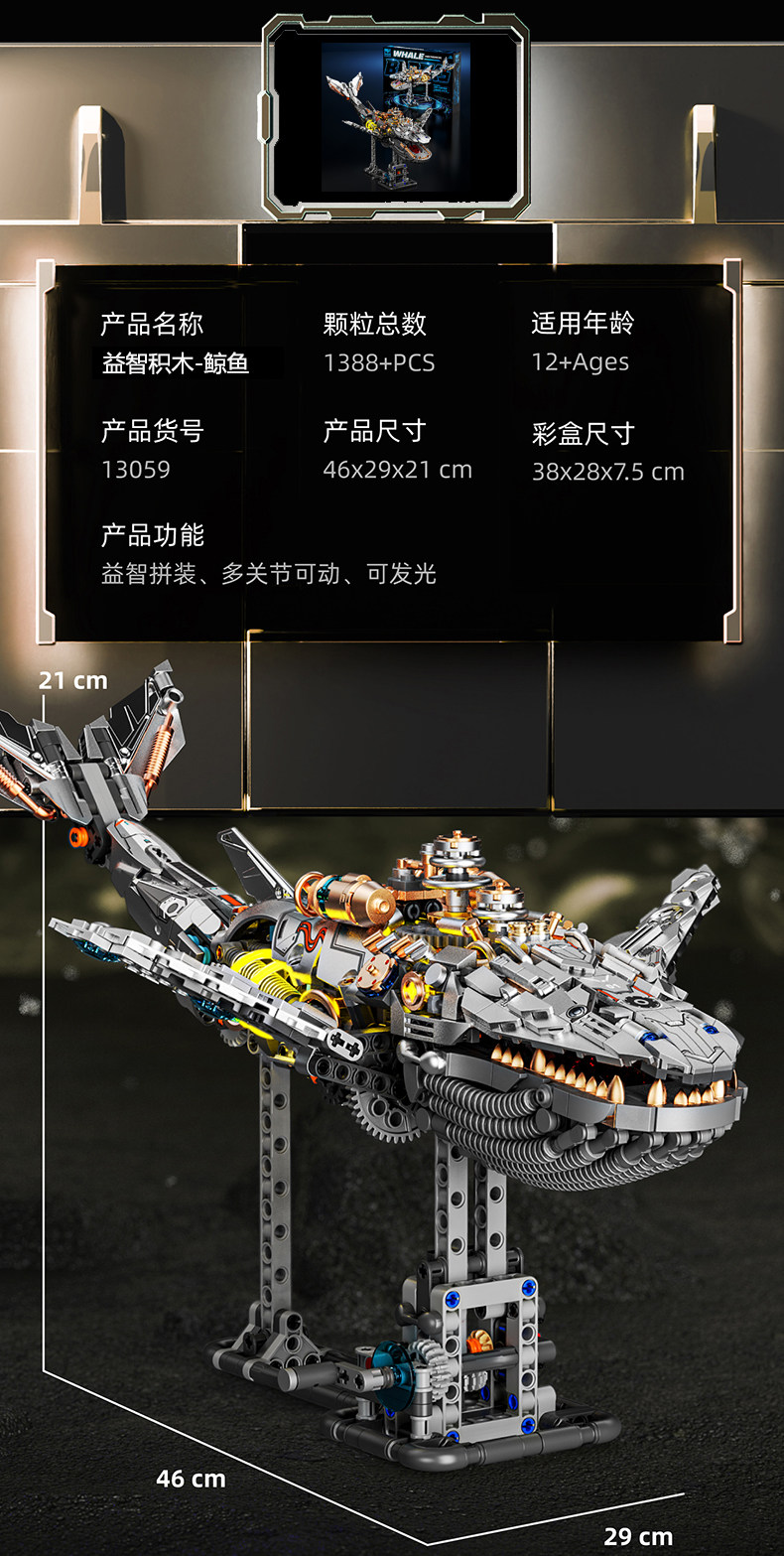 | Model | Christmas Edition: Mechanical Whale with Motor, Remote RGB Lights & Santa Claus, Clownfish Aquarium, 568 Pieces T4001, Electric dilophosaurus with lights, Electric owl with lights, Giant Semi-Mechanical T-Rex, Giant mechanical mosasaur, electric version, Giant mechanical mosasaur, hand-crank version, Hand-crank T-Rex, 1268 pieces with lights, Hand-crank blue dolphin with lights, Hand-crank cobra, 1186 pieces with lights, Hand-crank crocodile, 996 pieces with lights, Hand-crank dancing robot, 692 pieces with lights, Hand-crank dilophosaurus with lights, Hand-crank dragonfly, 866 pieces with lights, Hand-crank eagle, 1168 pieces with lights, Hand-crank frog, 898 pieces with lights, Hand-crank ice dragon, 1646 pieces with lights, Hand-crank lion, 1073 pieces with lights, Hand-crank manta ray, 966 pieces with lights, Hand-crank nautilus, 1190 pieces with lights, Hand-crank octopus, 1768 pieces with lights, Hand-crank owl with lights, Hand-crank pink dolphin, 888 pieces with lights, Hand-crank piranha with lights, Hand-crank shark, 687 pieces with lights, Hand-crank turtle, 1277 pieces with lights, Hand-crank warhorse, 1055 pieces with lights, Hand-crank whale with remote RGB lights, Hand-crank whale, 1388 pieces with lights, Mechanical Giant Beetle, 862 Pieces with Lights, Mechanical Mantis, 999 Pieces with Lights, Mechanical Parrot, 688 Pieces with Lights, Mechanical T-Rex, 1388 Pieces with Multi-Joint Linkage, Mechanical Triceratops, 1368 Pieces with Multi-Joint Linkage, Motor-Driven Mechanical Dragonfly, 866 Pieces with Lights, Motor-driven T-Rex, 1268 pieces with lights, Motor-driven blue dolphin, 888 pieces with lights, Motor-driven cobra, 1186 pieces with lights, Motor-driven crocodile, 996 pieces with lights, Motor-driven dancing robot, 692 pieces with lights, Motor-driven eagle, 1168 pieces with lights, Motor-driven frog, 898 pieces with lights, Motor-driven lion, 1073 pieces with built-in lights, Motor-driven manta ray, 966 pieces with lights, Motor-driven nautilus, 1190 pieces with lights, Motor-driven octopus, 1768 pieces with lights, Motor-driven pink dolphin, 888 pieces with lights, Motor-driven piranha, 1085 pieces with lights, Motor-driven shark, 687 pieces with lights, Motor-driven turtle, 1277 pieces with lights, Motor-driven warhorse, 1055 pieces with lights, Motor-driven whale with 6 AA batteries & remote RGB lights, Motor-driven whale with 6 AA batteries, 1388 pieces & lights, New Year premium whale with rechargeable motor, remote lights, lion dance minifigure & gift set, New Year whale with motor, lion dance minifigure & gift set, Premium whale with rechargeable motor & full-body RGB lights, Rechargeable motor blue dolphin, 888 pieces with lights, Rechargeable motor pink dolphin with lights, Rechargeable motor whale, 1388 pieces with lights |